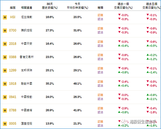 恒指波幅指数(VHSI)周三收报20.93,下跌1.09%。舜宇光学、吉利汽车、中国联通相关认购证引伸波幅过去五日变化较大,分别为下跌2.7%、3.4%、上涨1.1%。认沽证方面,依然是舜宇光学位居榜首,大跌54.4%,其次是中国联通,上涨28%。