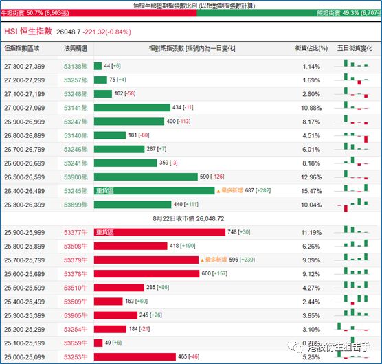 街货分布方面,截至周四,恒指牛证主要分布在25600点至26000点区域,累计期指合约2362张;恒指熊证主要分布在26300点至26800点区间,累计期指合约2363张。