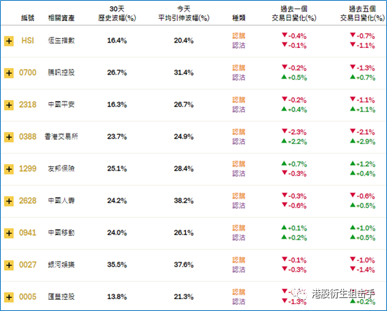 恒指波幅指数(VHSI)周四收报20.43,下跌2.39%。港交所、友邦保险、舜宇光学相关认购证引伸波幅过去五日变化较大,分别为下跌2.1%、上涨1.2%,下跌3.5%。认沽证方面,舜宇光学、石药集团均大跌,分别为54.8%、51.6%。