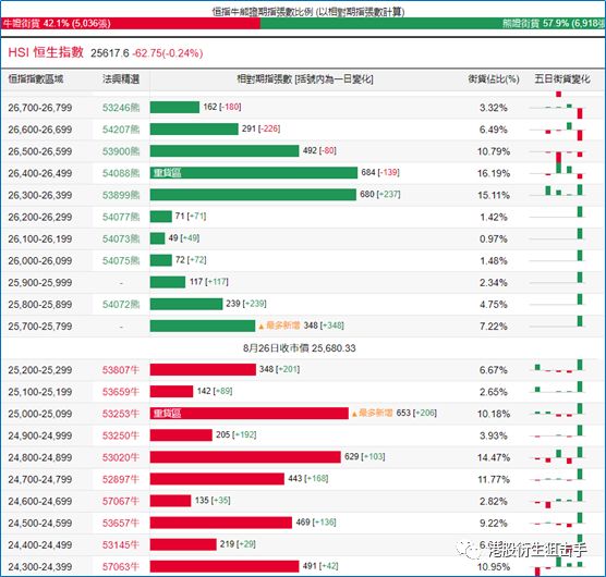 街货分布方面,截至周一,恒指牛证分布在29300点至26000点的期指合约均被收回;恒指熊证新增区域分布在25700点至26300点区间,累计期指合约为896张。
