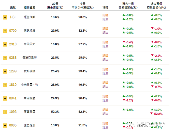 恒指波幅指数(VHSI)周一收报23.97,上涨17.67%。港交所、美团点评、中国铁塔关认购证引伸波幅过去五日相对变化较大,分别为下跌2.1%、上涨2.3%、下跌2.6%。认沽证方面,石药集团、舜宇光学、美团点评过去五日变化超5成,分别为下跌52.2%、上涨50.7%、下跌50.3%。