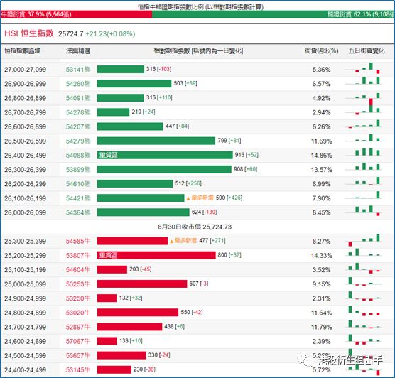 街货分布方面,截至上周五,恒指牛证主要分布在区域25000点至25400点之间,累计期指合约2087张;恒指熊证分布在25800点至26000点之间的期指合约均被收回。
