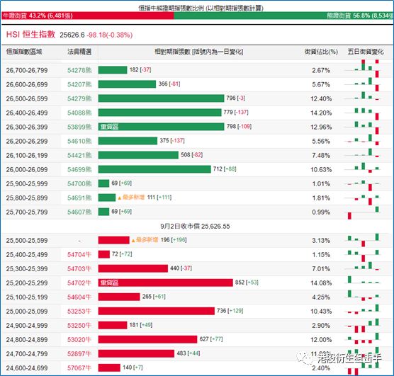 街货分布方面,截至周一,恒指牛证新增区域25400点至25600点,累计期指合约268张;恒指熊证分布在25700点至26000点区间的期指合约均被收回。