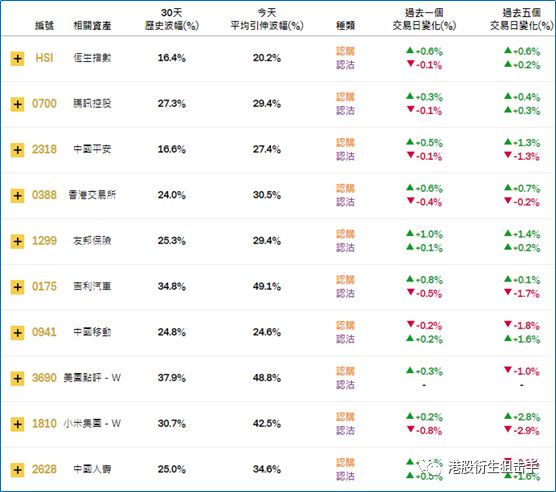 恒指波幅指数(VHSI)周一收报23.89,下跌1.08%。碧桂园相关认购证引伸波幅过去五日大跌近6成。其余中国移动、小米集团、新鸿基地产变化亦靠前。认沽证方面,小米集团、融创中国、建设银行过去五日分别变化为下跌2.9%、上涨2.2%、下跌2.4%。