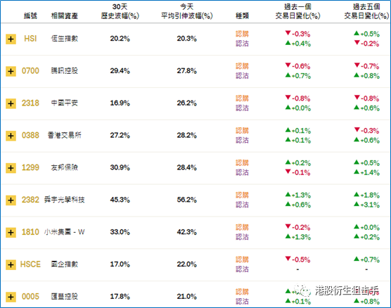 恒指波幅指数(VHSI)周四收报21.3,上涨0.09%。舜宇光学、吉利汽车、美团点评相关认购证引伸波幅过去五日变化较大,分别为上涨1.8%、下跌1.9%、1.9%。认沽证方面,石药集团、中海油、美团点评变化较大,分别为大涨55.4%、下跌31.8%、上涨56.5%。