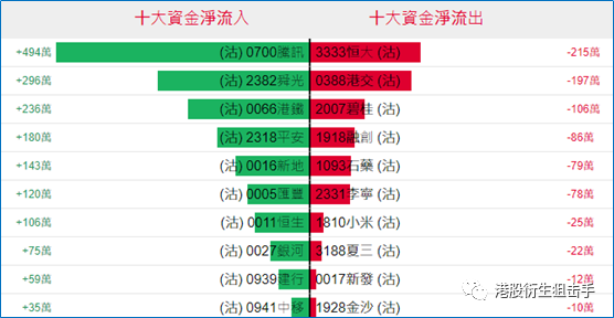 认沽证方面,周三有494万、296万港元分别净流入腾讯、舜宇光学部署空单,而有少量资金净流出恒大、港交所止损。