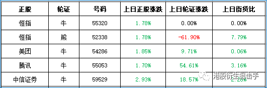 恒指周三投资气氛造好,重越50日线。当日恒指牛证录得约6651万港元净流出,过去五天累计净流出为3734万港元;恒指熊证单日约1.25亿港元净流入,过去五日累计净流入为2.67亿港元。