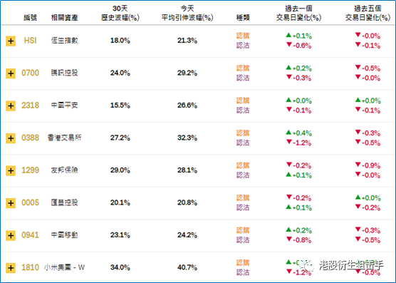 恒指波幅指数(VHSI)周三收报19.05,上涨0.32%。瑞声科技、吉利汽车、石药集团相关认购证引伸波幅过去五日变化较大,分别下跌2.1%、上涨1.2%、下跌1.1%。认沽证方面,变化较大的有中国铁塔及瑞声科技,分别为下跌1.7%、1.1%。