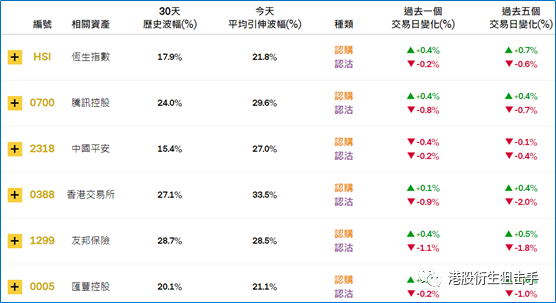恒指波幅指数(VHSI)周四收报18.74,下跌1.63%。舜宇光学、中国铁塔、银河娱乐相关认购证引伸波幅过去五日变化较大,分别上涨2.3%、下跌2%、上涨1.6%。认沽证方面,变化较大的有港交所、吉利汽车、中国铁塔,比例为下跌2%、7.9%、3.5%