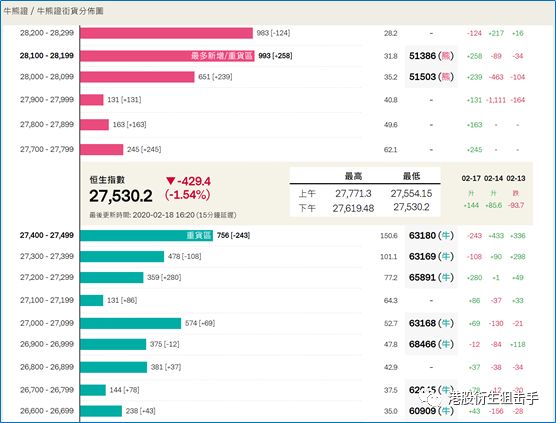 街货分布方面,截至周二,恒指牛证密集分布在收回价27100点至27500点区间,相当约1724张期指合约;而熊证则集中分布在收回价27700点至28700点区间,相当约5495张期指合约。