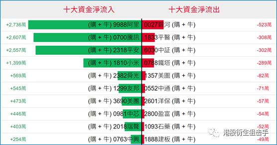 好仓(认购证及牛证)方面,有2736万、2607万及2557万港元资金分别净流入阿里、腾讯及平安部署造多,资金流出方面,有少量资金净流出平安好医生套现。