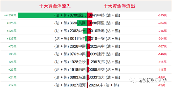 淡仓(认沽证及熊证)方面,有4357万、625万港元资金分别净流入腾讯、美团部署空单,而有少量资金净流出中国移动套现。