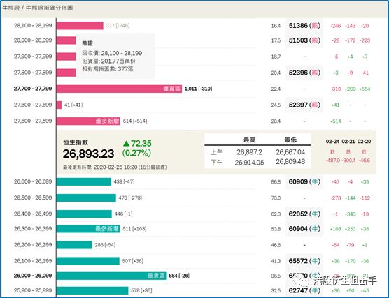 街货分布方面,截至周二,恒指牛证密集分布在收回价26000点至26700点区间,相当约3551张期指合约,而熊证则集中分布在收回价27500点至28300点区间,相当约3035张期指合约。