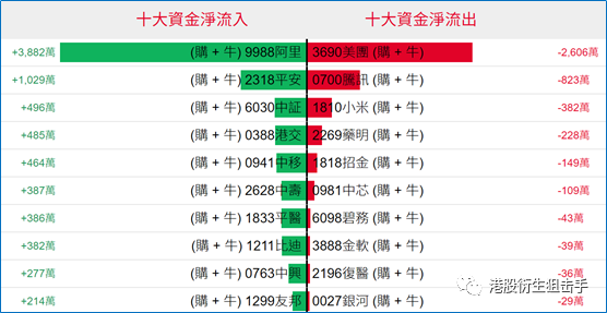 好仓(认购证及牛证)方面,有3882万、1029万及496万港元资金分别净流入阿里、平安及中证部署造多,而有2606万、823万港元资金净流出美团、腾讯套现。