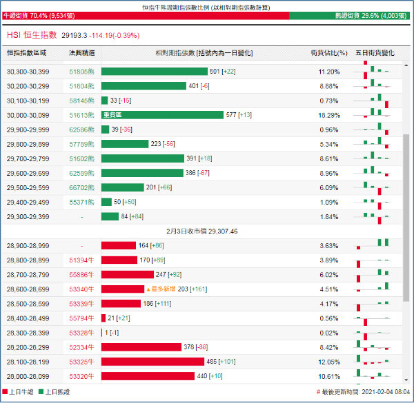 街货分布方面,至周三,恒指牛证街货主要在收回价28500点至29000点之间,贴价街货量累计相当约656张期指合约;恒指熊证街货在收回价29300点至29800点之间,相当约1112张期指合约。