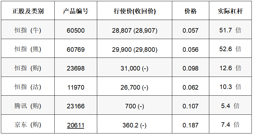 恒指一连两日在29000点关口附近反覆震荡,方向未明,28300点仍为中短期重要支持,短线反弹目标29500点水平。如看好恒指可留意牛证60500,收回价28907点;认购证23698,行使价31000点。相反,如看淡可留意熊证60769,收回价29800点;认沽证11970,行使价26700点。