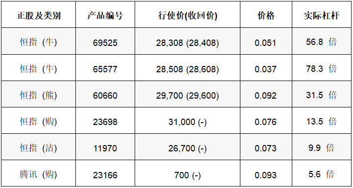 恒指昨日反弹至最高29596点,午后升幅收窄,走势维持在区间内反覆,短线或回试28800点水平,28300点为中短期重要支持。如看好恒指可留意牛证65577,收回价28608点,牛证69525,收回价28408点;认购证23698,行使价31000点。相反,如看淡可留意熊证60660,收回价29600点;认沽证11970,行使价26700点。