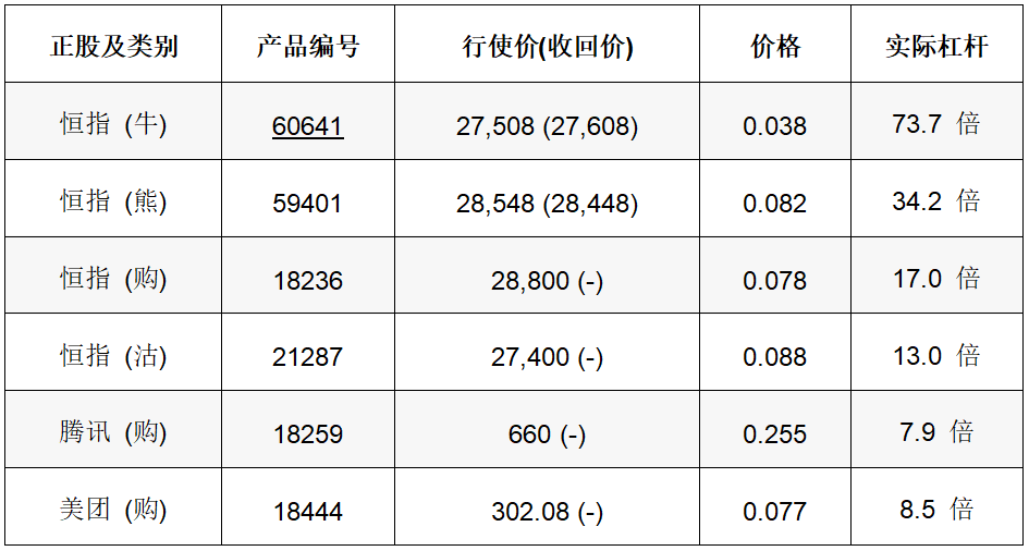 昨日恒指裂口跌穿28300点支持,随即顺势下试28000点关口,最低曾见27910点,技术走势转淡,有机会进一步下试3月低位27500点水平。如看好恒指可留意牛证60641,收回价27608点;认购证18236,行使价28800点。相反,如看淡可留意熊证59401,收回价28448点;认沽证21287,行使价27400点。