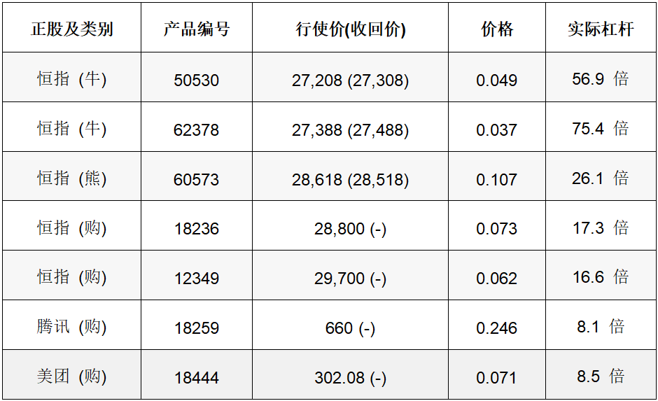 昨日恒指反弹至周二跌市的裂口附近,无改大市跌穿28300点后的反覆下跌趋势,今早料随外围试穿27900,倘若失守,留意跌势会否加快,下一目标先看3月低位27500点水平。如看好恒指可留意牛证50530,收回价27308点,牛证62378,收回价27488点;认购证18236,行使价28800点;认购证12349,行使价29700点。相反,如看淡可留意熊证60573,收回价28518点。